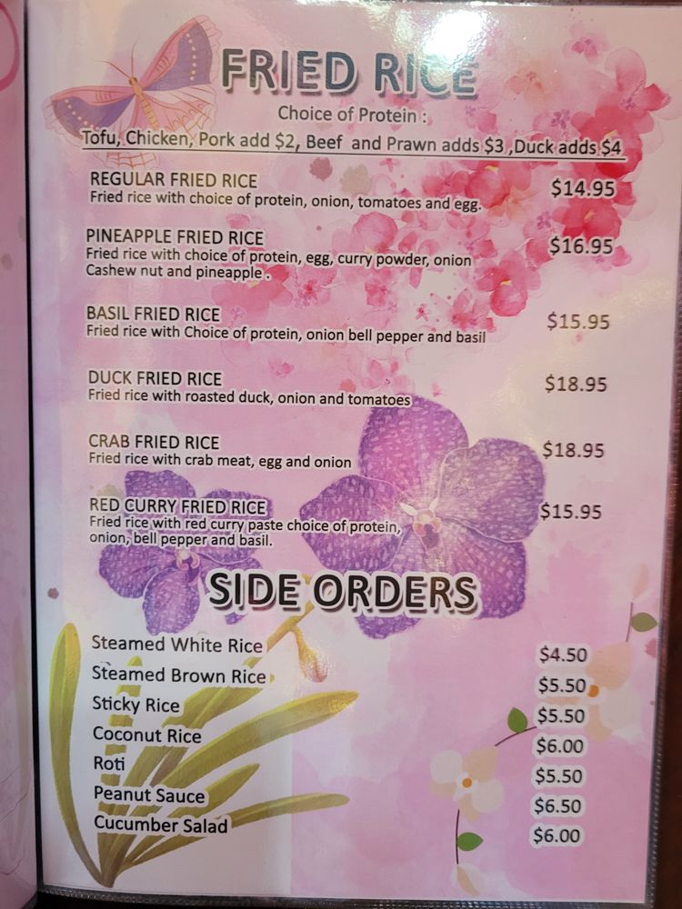 Fried rice with red curry paste, choice of protein, onion, bell pepper, and basil.